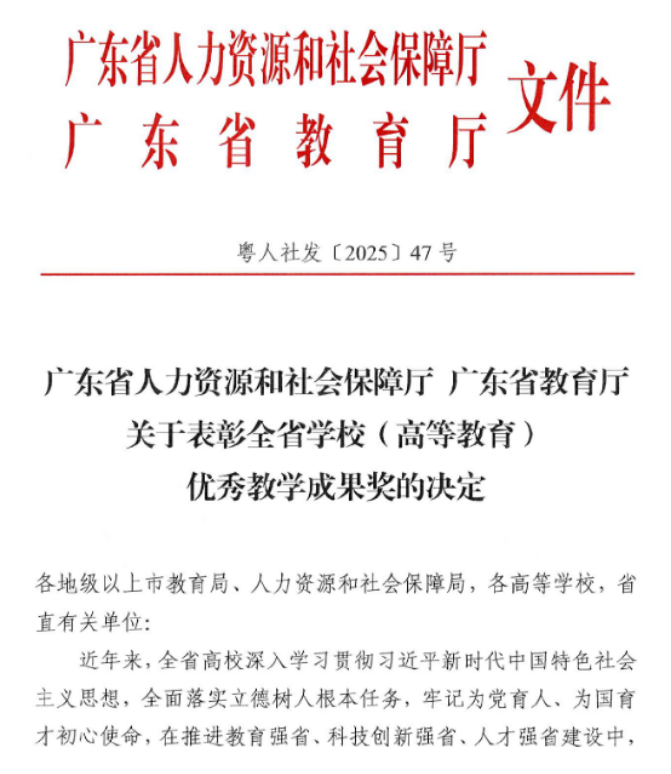 近日,广东省人力资源和社会保障厅、广东省教育厅公布2025年全省学校(高等教育)优秀教学成果奖获奖名单,小狐狸直播 凭借深厚的教育教学改革创新积淀,本科类、研究生类教学成果双双获奖,共斩获一等奖2项、二等奖2项。