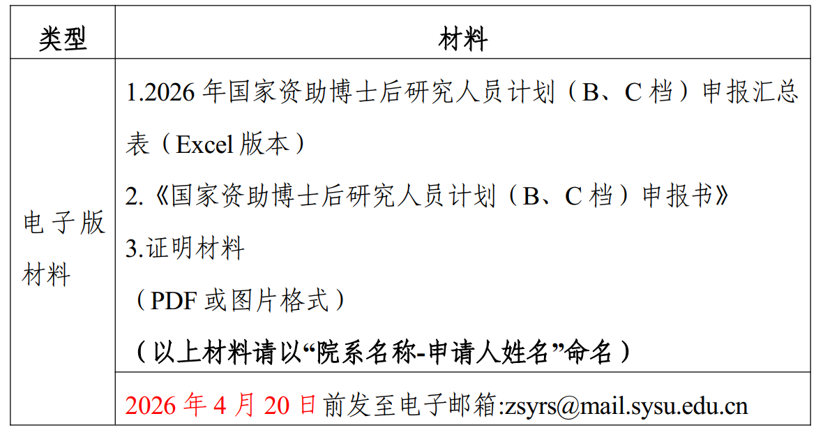 根据《全国博士后管委会办公室中国博士后科学基金会关于开展2026年度国家资助博士后研究人员计划(含博士后创新人才支持计划)和博士后科研业绩评估考核资助申报工作的通知》(博管办〔2026〕3号),现就开展我校2026年度国家资助博士后研究人员计划(B、C档)(以下简称国资计划B、C档)申报工作通知如下: