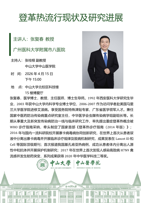 导航痕迹 小狐狸直播 科学研究 学术讲座 登革热流行现状及研究进展 科学研究 科研通知 学术讲座 科研平台 办理指引 登革热流行现状及研究进展 发布人:张玉琦 发布日期:2026-04-09