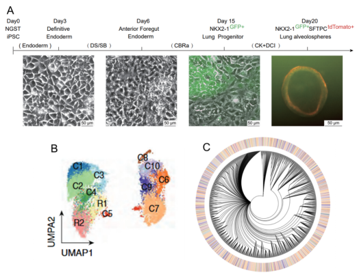 Members of Professor Yang Jianrong's team used an in vitro induced differentiation system to simulate the stage of primitive lung progenitor cell formation during early embryonic lung development. Meanwhile, they incorporated an optimized scGESTALT cell lineage tracing system into the cells, successfully determining the single-cell transcriptome and cell lineage barcodes of 50% of the cells in the population, and constructing cell lineage trees for four samples.