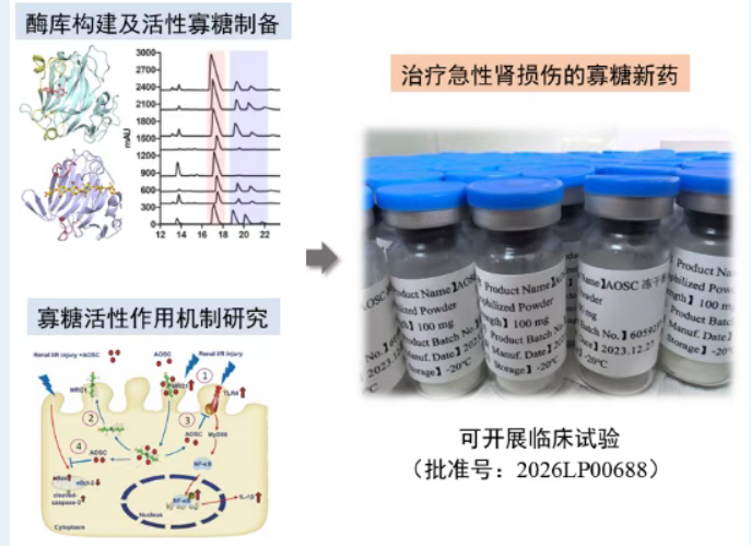 近日,小狐狸直播 王蔚东、李春凌教授课题组在海洋活性寡糖转化应用领域取得重要进展。团队联合国内高校与产业界历经十余年攻关,共同研发的“治疗急性肾损伤的海洋寡糖”创新药正式获国家药品监督管理局临床试验批准(批准号:2026LP00688),标志着该成果从基础研究迈向临床转化关键阶段,成为课题组近年产学研用协同创新的标志性成果。
