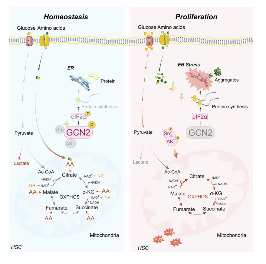 研究团队进一步发现,静息状态下,造血干细胞通过氨基酸代谢维持着低氧化磷酸化的能量状态。活化状态下,由于体内骨髓微环境和体外培养基中有大量的氨基酸供给,造血干细胞摄取氨基酸的能力加强,细胞内的氨基酸含量迅速积累。从而提高造血干细胞内蛋白质翻译,通过增加葡萄糖摄取和线粒体氧化磷酸化的代谢方式产生大量ATP,促进细胞增殖。同时,GCN2-eIF2α通路维持着造血干细胞蛋白质稳态。GCN2识别未结合氨基酸的tRNA,通过磷酸化eIF2α抑制蛋白质翻译。缺失GCN2的造血干细胞,在活化时蛋白质翻译显著加速,蛋白质稳态失衡,长期造血能力受损。通过代谢物筛选方式,发现NAD+前体烟酰胺核糖(Nicotinamide Ribose,NR)可通过增强氨基酸分解代谢的方式,增强造血干细胞在活化态下的蛋白质稳态维持能力。利用GCN2敲除小鼠证实,长期NR处理是通过激活GCN2调控蛋白质稳态的方式促进了造血干细胞在活化状态下长期造血能力的维持。同时还发现GCN2可以调控造血干细胞的能量代谢。